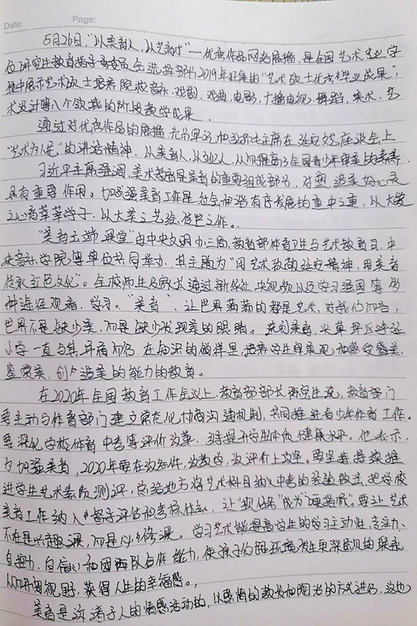 通过这几天的“美育云端课堂”,同学们感触颇丰:从合唱作品《我们》中,深深感受到国家抗疫必胜的信心;从慷慨激昂、气势磅礴的音乐中感受到老一辈艺术家对祖国大好河山的赞美,激发了同学们的爱国之情。几期音乐党课,讲述了经典的歌曲的来龙去脉,讲解来自歌声中的故事,让学生们重新认识了这些耳熟能详的经典歌曲,认知了这些歌曲在战争年代的力量,在和平时期的作用与精神。既有中国传统音乐的风韵,又有新时代的特性,是具有史诗性的里程碑。同学们通过此次“美育云端课堂”,在对艺术美有了更深层次的认知的同时,也提高了个人情趣和精神境界,同学们纷纷表示,要继续传承红色基因,培育文明风尚,在高雅艺术的熏陶中不断进步、成长。