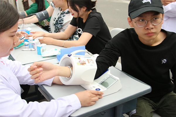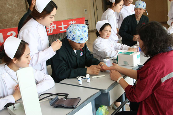 除授帽仪式外,医护分院为纪念此次护士节,在学院教工食堂、学生二食堂、博爱楼一楼等处开展爱心义诊活动。参加此次爱心义诊的老师和青年志愿者们分工明确,井然有序的在各自的工作岗位上为前来的“三产”人员、老师和同学们作诊断筛查。志愿者们给予他们最关切的问候,并用心为其测量血糖、血压和讲解心肺复苏等急救知识。与此同时,面对老师和同学们对健康方面的疑问,志愿者们亦将理论与实践相结合,尽心尽力为他们讲解。