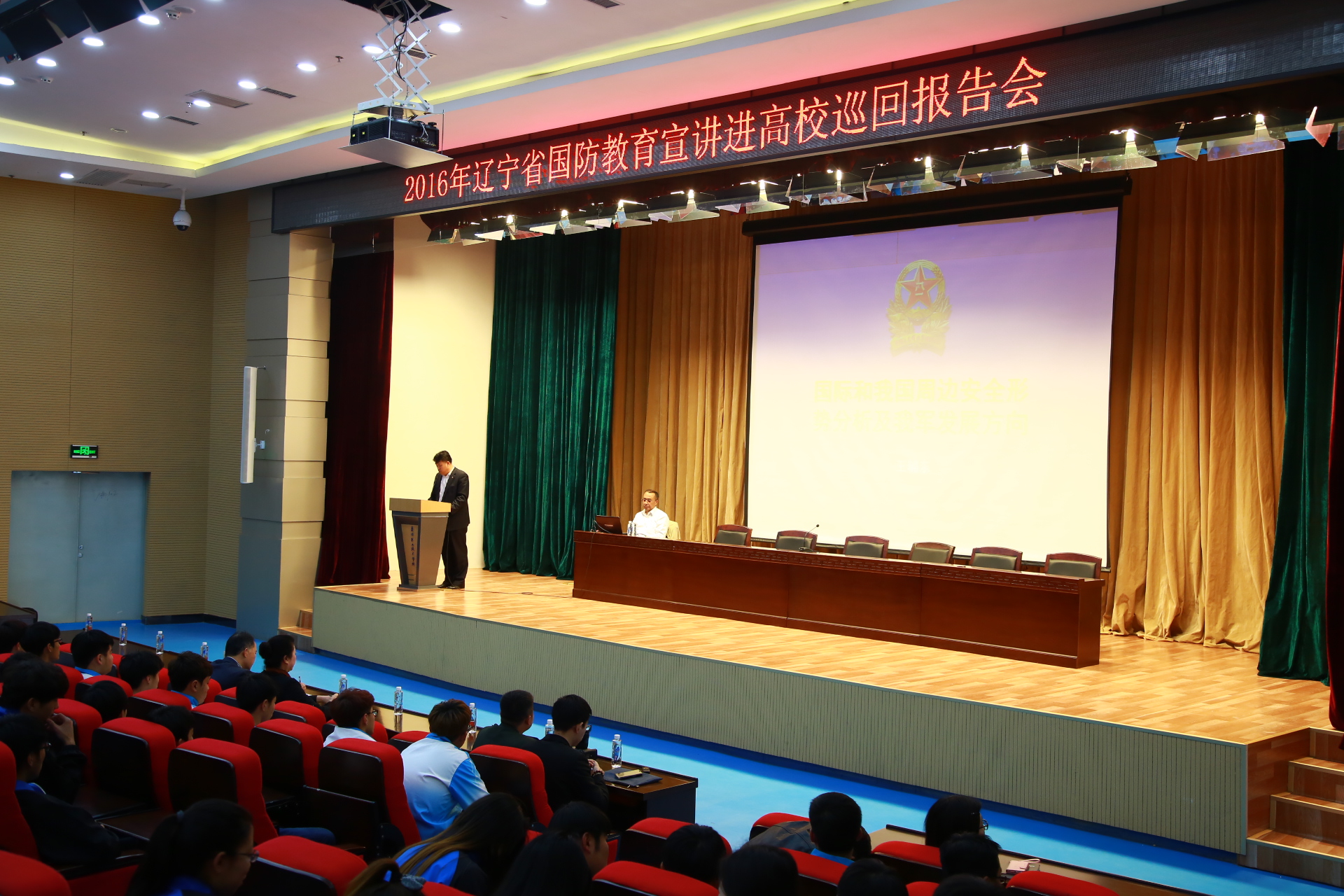 本次报告会特邀辽宁省国防教育巡回宣讲团王辅东大校主讲。王辅东大校用了1个半小时,围绕国际安全形势、我国周边安全环境隐患及我军未来发展方向等相关问题,重点分析了现代军事、国防、国际政治形势,并呼吁青年学子要心系国防、关注国防,正确认识从军、强国,把青春和热血献给伟大的国防事业。讲座生动精彩,学生深受鼓舞。