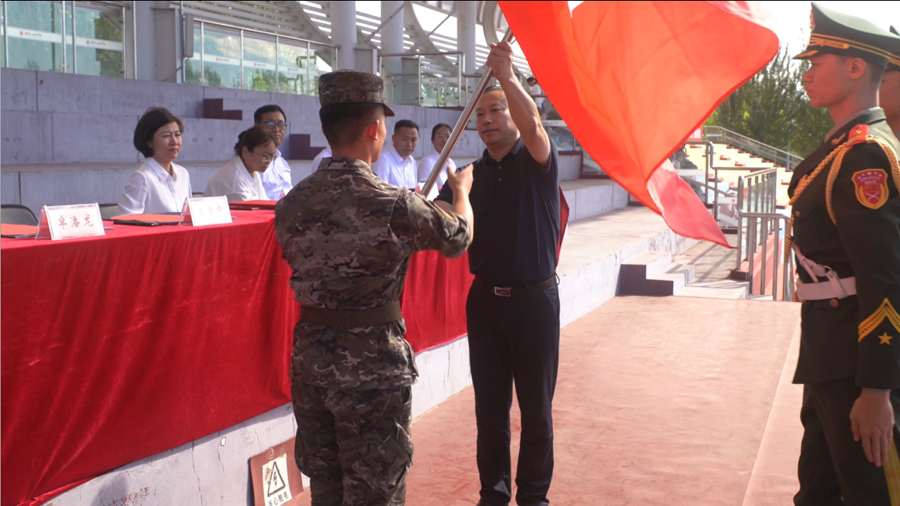 最后,党委书记王首中向军训营授旗,标志着2025级新生军训正式启动。
