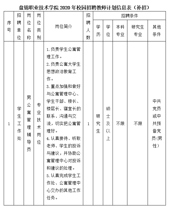 一、《awc777万象城娱乐官网2020年校园招聘教师计划信息表》中,补招男公寓管理辅导员1人,具体要求如下: