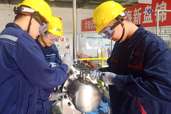 学院化工生产实训中心燃料油常压蒸馏装置由于法兰垫片老化,严重漏液,急需更换密封垫片。吴春丽老师跟设备厂家沟通后,厂家只能邮寄密封垫片,不能派工程师前来更换。面对不可耽搁的教学工作,刘洪宇老师和吴春丽老师带领17级中德化工班赵洪琪、李建行、王忠瑞等学生利用课余时间更换密封垫片。在维修过程中,老师和同学们强忍着设备中的物料散发的刺鼻气味,将防护眼镜和手套配戴整齐,积极发扬不怕脏、不怕累的化工精神,两个多小时后,完成了所有老化垫片的更换,以保证教学工作的顺利进行。