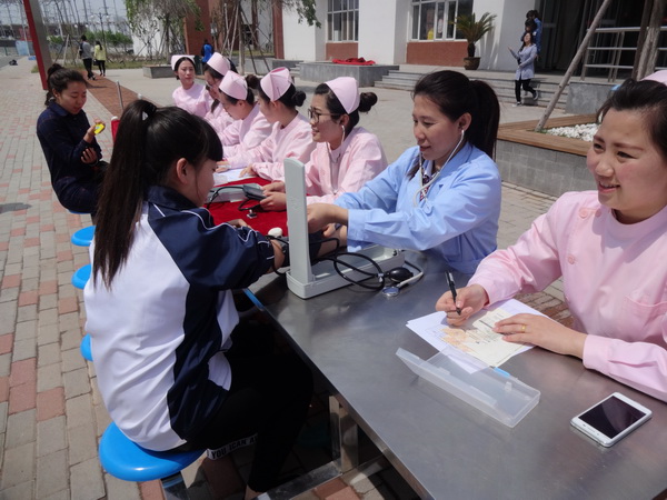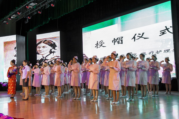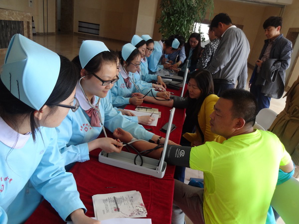 本次庆祝活动共分为测量血压,血糖等义务活动、授帽仪式、“天使风采”文艺演出等三大部分。测量血压、血糖等义务活动于5月12日中午在万象城官网的第一食堂和教工食堂进行,由医疗护理分院的部分老师和同学们身着整洁的护士服,手拿测试仪器和记录单为部分师生进行血压、血糖及身高体重等项目的测定,并热心的对同学们进行了健康知识的宣传和讲解。一群衣着整洁的白衣天使,像一朵朵竞相开放的花儿,成为了校园内一道亮丽的风景线。