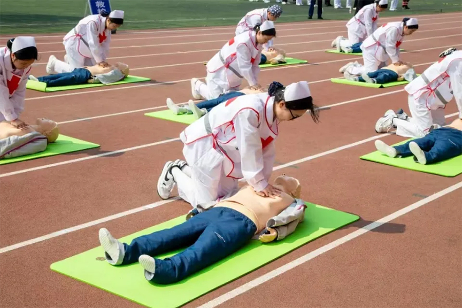 在救援环节,辽东湾新区消防救援大队出动云梯车搭建“空中生命通道”,内攻小组与搜救小组协同配合,成功营救3名“被困”学生。演练还设置医疗救援场景,盘锦市红十字应急救护服务队现场演示止血包扎、心肺复苏等急救技能,强调“黄金四分钟”救援原则,指导师生掌握“快、准、轻、牢”的包扎要领与“C-A-B”心肺复苏操作流程。