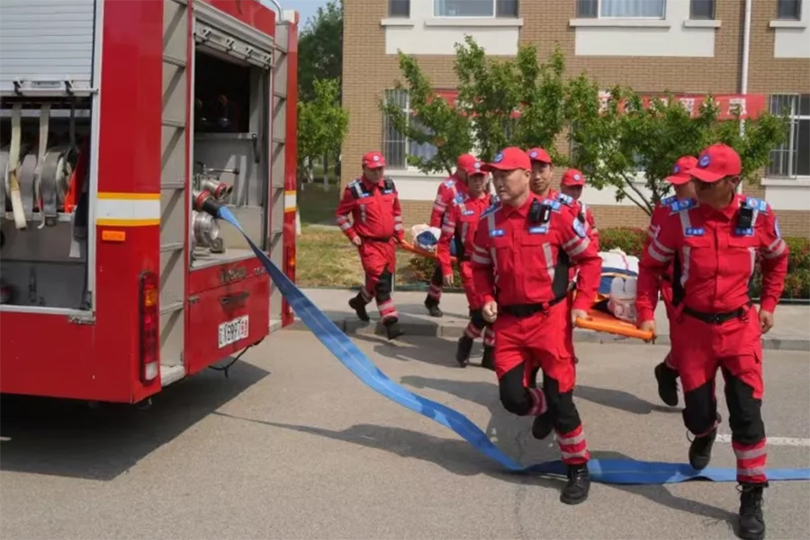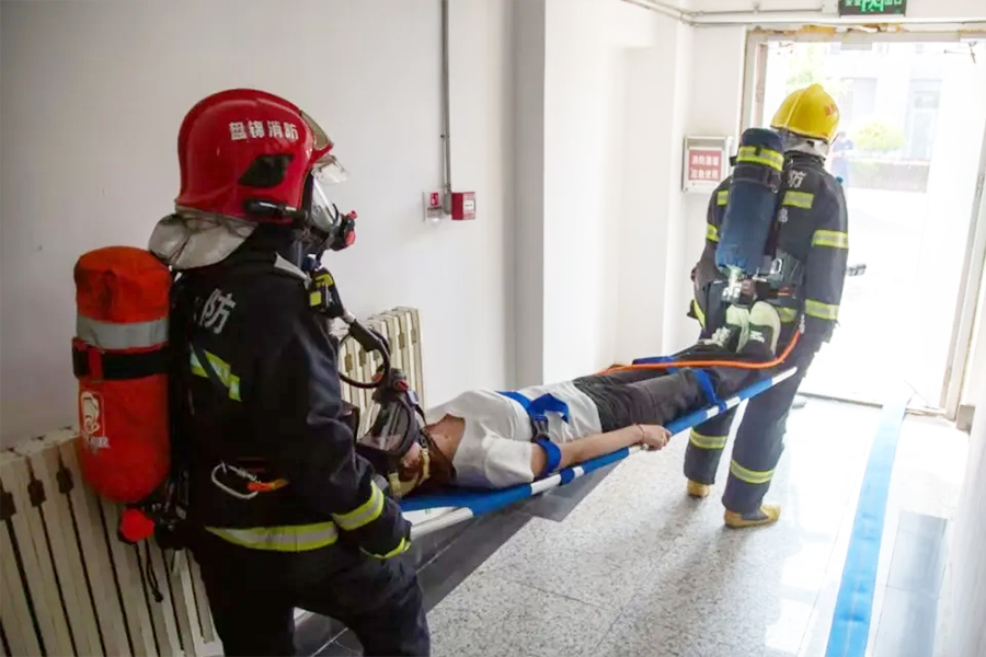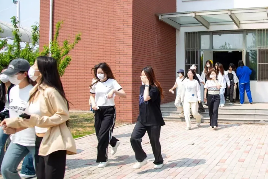 演练以B座学生公寓310寝室电器故障引发火灾为模拟场景。火灾自动报警系统监测到烟雾浓度超标后,消防控制室值班人员迅速启动应急响应,通知安保人员赶赴现场确认火情。与此同时,楼内消防广播引导学生用湿毛巾捂口鼻、俯身弯腰沿安全通道有序疏散。微型消防站队员三分钟内抵达现场,同步开展初期火灾扑救与人员搜救。
