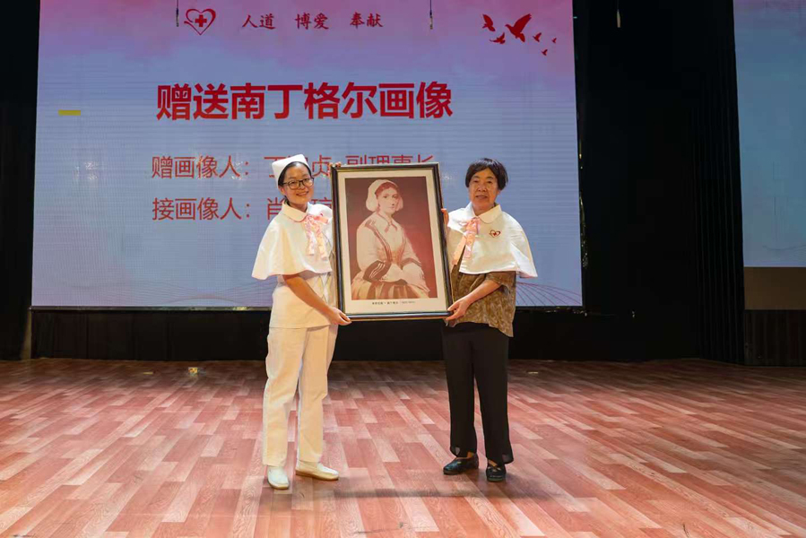 丁淑贞副理事长将南丁格尔画像赠予副队长肖靖琼。旗帜与画像象征着使命与责任的传递,也寓意着精神的接续与发扬。