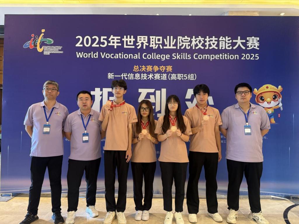 2025年9月6日至12日,2025年世界职业院校技能大赛新一代信息技术赛道高职组总决赛在江苏常州举行。来自全国28个省(自治区、直辖市)的251支代表队齐聚一堂,同台竞技。万象城官网由张松林、韩非、张栋老师指导,夏志涵、周春桐、刘馨文、李锦萍四名同学组成的参赛队,凭借扎实的专业功底、出色的团队协作和突出的创新能力,在众多强队中表现优异,荣获铜奖。